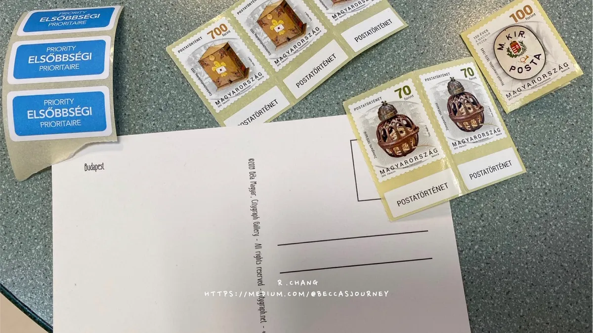 除了郵資本身,櫃檯人員會詢問說需優先寄到嗎?就是PRIORITAIRE這張郵票(不一定要買大家自行評估),匈牙利的郵票是貼紙!可以直接黏,避免找不到膠水、漿糊這種囧境。寫明信片除了地址要寫Taiwan(R.O.C)之外,把Tajvan字樣加上去(這是從強大的Google查到的)也可以避免寄丟,畢竟跨國寄件過程會發生什麼事很難說。