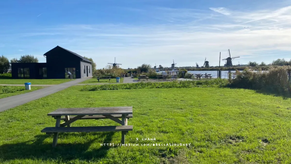 公路旅行第一個正式景點是小孩堤防(埃爾斯豪特風車群),它也是世界文化遺產,也是荷蘭保留最完整原始的風車,風車就像是荷蘭的靈魂。這天來訪的旅客不算太多,有看到兩、三團樂齡長輩們很認真地參觀,我們隨著風車群的方向走,放眼望過去那景象真的蠻壯觀的,在七、八月的每個星期六,這邊的19座風車會一起轉動,好想要在那個時候再訪!!這次因為我們是徒步沒有租腳踏車,大家體力有限,下次想要租車騎仔仔細細看這19座風車在這邊待上一天的時間。這裡空曠到讓人心情很好,藍天、綠地和風車的組合我很喜歡。另外自助帶著一行人一起旅行,一天能走的行程最多大概一到兩個最多,大家可以自行斟酌。
