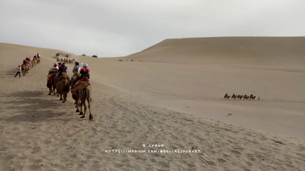 鳴沙山除了有滑沙活動之外,也有駱駝體驗,第一次看到沙漠和駱駝的組合,太興奮決定要去體驗,就這樣被駱駝帶著繞鳴沙山,好想知道古代商隊穿越絲路的人是抱著什麼樣心情完成渺茫又艱辛的路途。
