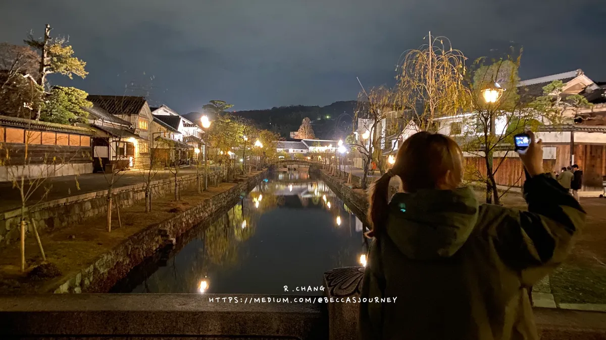 倉敷一帶發展與倉敷川密不可分,倉敷川成為貨物集散重要運河,水陸發展伴隨而至是繁忙的商業貿易往來,可想而知需要大量倉庫(即土藏群)同時帶來繁榮景緻。倉敷美觀地區是日本傳統建造物群保存地區之一,現在所看到的商店、茶屋、餐廳,正是前面提到土藏群。這一區很適合從下午待到晚上,夜景很驚艷,我很喜歡。有機會大家可以來感受一下夜晚氛圍。